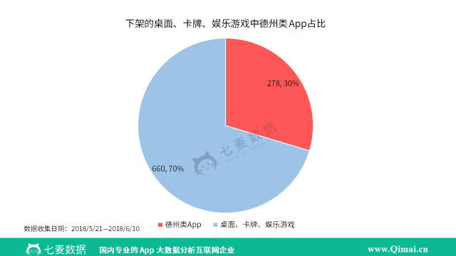 事实真的是这样吗?我们接着往下看,德州类 App 主要分布在“桌面游戏、卡牌游戏、娱乐场游戏”三个子分类中,在 5 月 21 日— 6 月 1 日期间,德州类 App 共上架了 23 款,占比只有 6%。而下架中,德州类 App 共有 278 款,占比达到 30%。