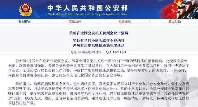 就在大家惊诧之时,公安部 1 月 29 日在京召开视频会议,部署全国公安机关进一步深化打击整治赌博违法犯罪活动。