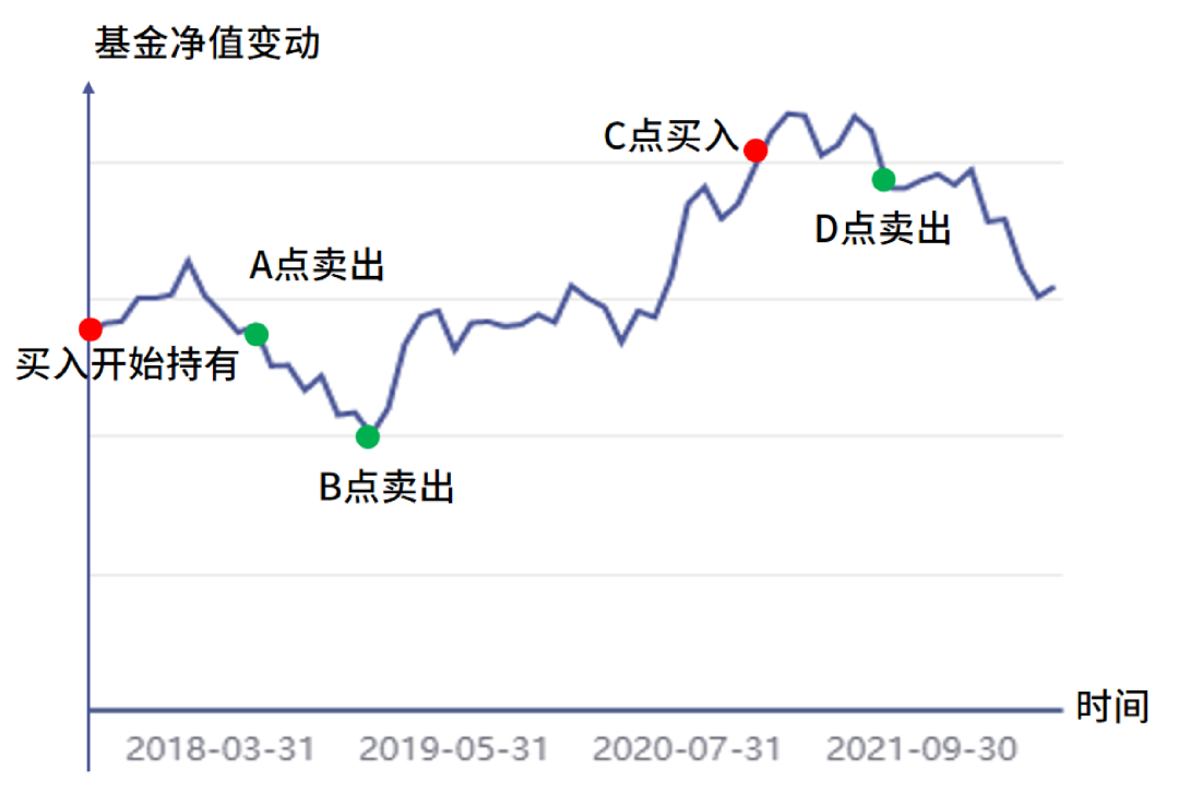 举个栗子:小李持有某只基金近3年,收益曲线及买入卖出点位如下图所示。