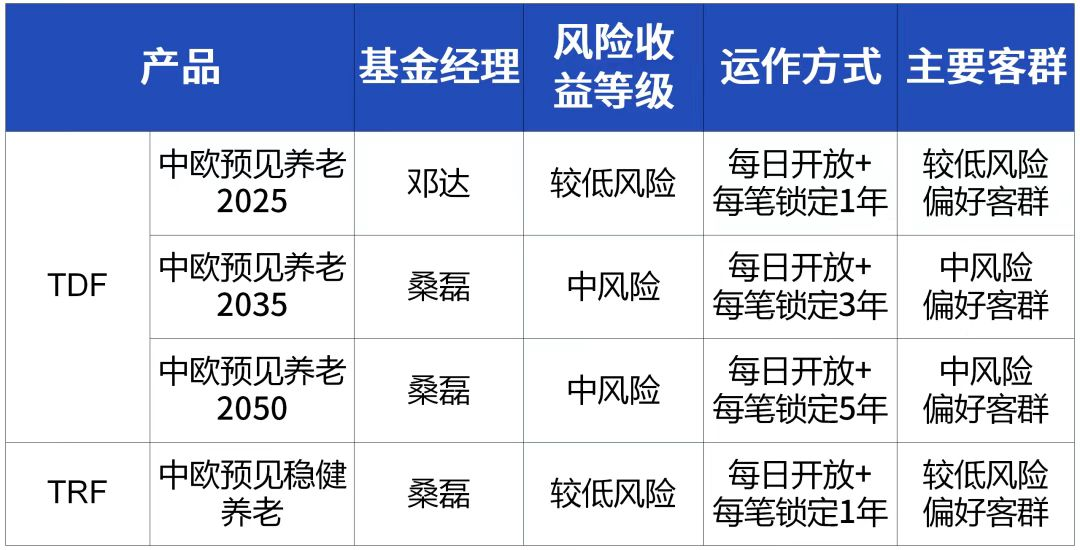 就拿中欧基金目前已布局的养老目标基金——中欧预见养老2035、中欧预见养老2050、中欧预见养老2025来说,由于目标退休日期不同,当前的权益资产比例,和适应的风险偏好目标人群便也有所不同。而作为基金管理人,我们也在不同的年份不同的环境中,为了远方的目标,每天每月每年多努力一点点。