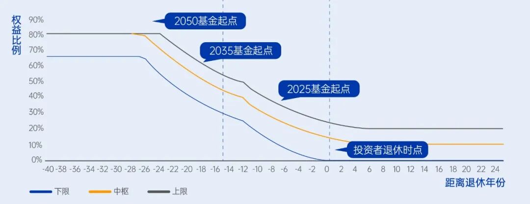 如果上面这些跟随年龄增长而来的担忧,你听起来觉得“有点扎心了”。那么,个人养老金账户的可选投资标的之一,养老目标日期基金可能就正合适你每年1万2的小小努力。这类产品以名字里明示的退休年份为目标,规划大类资产配置,以权益类资产配置比例的下滑曲线,回应不同年龄的不同担忧。