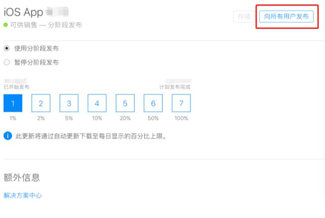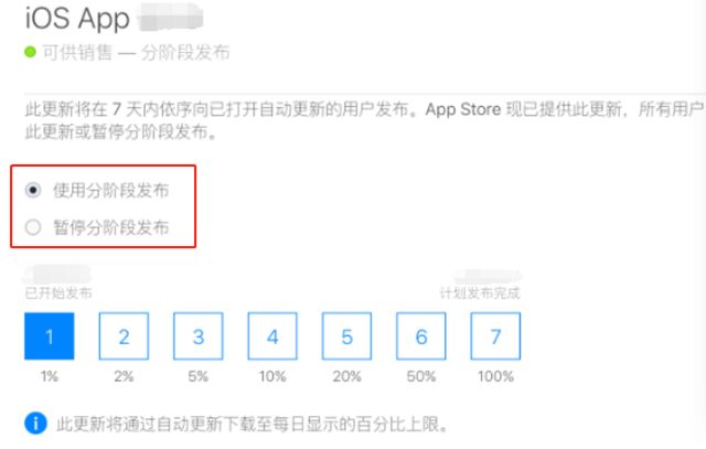 通过分阶段发布,App 的版本更新将在 7 天内以递增的比例向已打开自动更新的用户发布,用户不能选择特定人群,为随机挑选,且不会被通知。在此期间每天完成自动更新的用户百分比会显示在 iTunes Connect 中,如图: