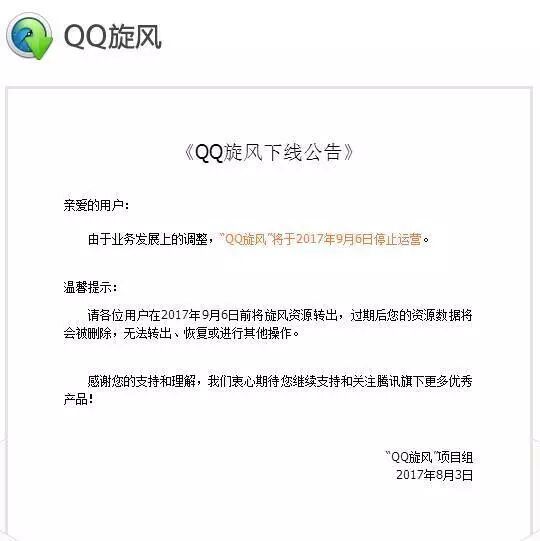 2017 年 8 月 3 日,腾讯旗下下载工具“ QQ旋风 ”在官网宣布正式停止运营,具体的服务时间截至 9 月 6 日,并提醒用户在 2017 年 9 月 6 日前将旋风资源转出,过期后资源数据将会被删除,无法转出、恢复或进行其他操作。