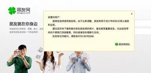 2017 年 7 月 14 日,腾讯旗下社区平台“朋友网”在官网上发布停服公告,称网站将于 8 月 6 日停止服务和运营。“朋友网”官网告示原文:“亲爱的用户:感谢您选择使用“朋友网”。由于业务调整,“朋友网”将于 2017 年 8 月 6 日停止服务和运营。建议您尽快下载和备份您在“朋友网”的照片、留言板等重要信息。对此给您带来的不便我们深表歉意,同时感谢您的理解与支持。”
