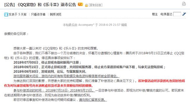 最近,腾讯在其官方论坛声称,将于 2018 年 9 月 15 日正式停止《QQ宠物》和《乐斗Ⅱ》的运营。其中,停运的具体时间节点为:2018 年 07 月 05 日,停止游戏充值和新用户注册;2018 年 09 月 15 日,正式停止游戏运营,关闭游戏,停止官方渠道游戏客户端下载,玩家无法登陆游戏;2018 年 09 月 30 日,游戏官网、论坛、专属客服关闭。