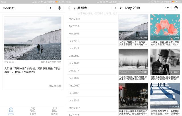 这是一款由个人独立开发的小而美的小程序。主要有3 个版块:小卡片、小视频、最美音。