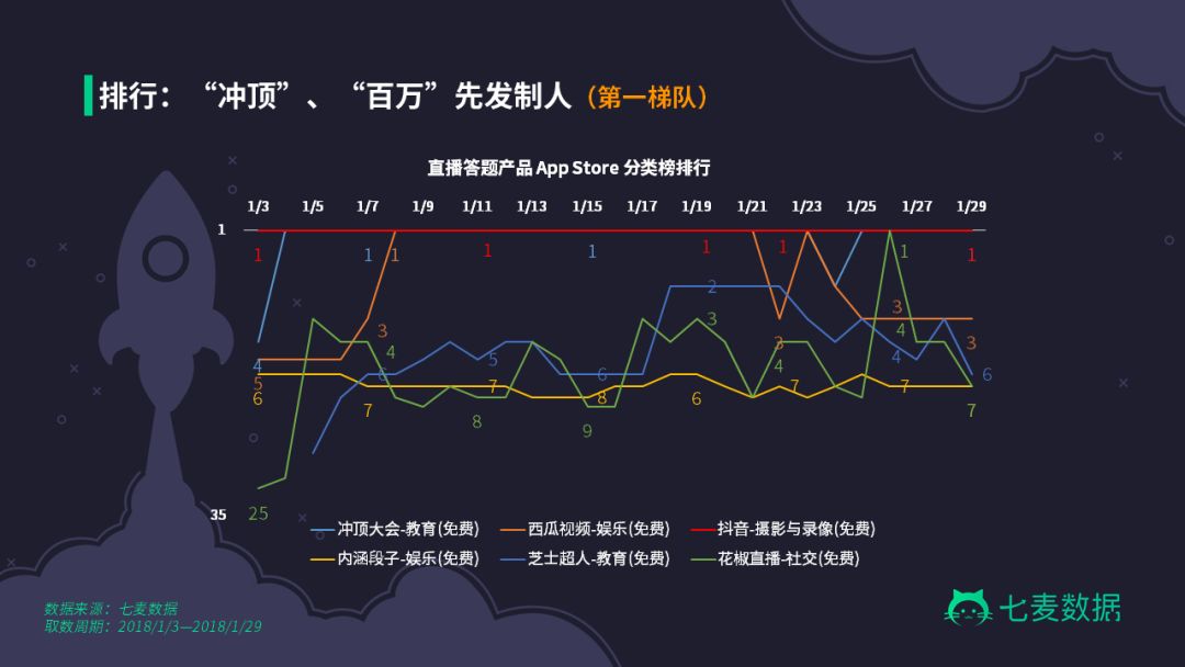 从目前的形式来看,先入局者先发制人,后入局者难起波澜。最先上架的“冲顶大会”占得天时,一时热度大涨,排名飞速上升。而疯狂撒币的“百万英雄”、“百万赢家”吸引更多在线人数关注,广告、获客量剧增。虽占得先机,但仍需谨慎。作为知识问答产品,先入局的花椒直播因出题严重失误被责令整改,排名变化大受影响。