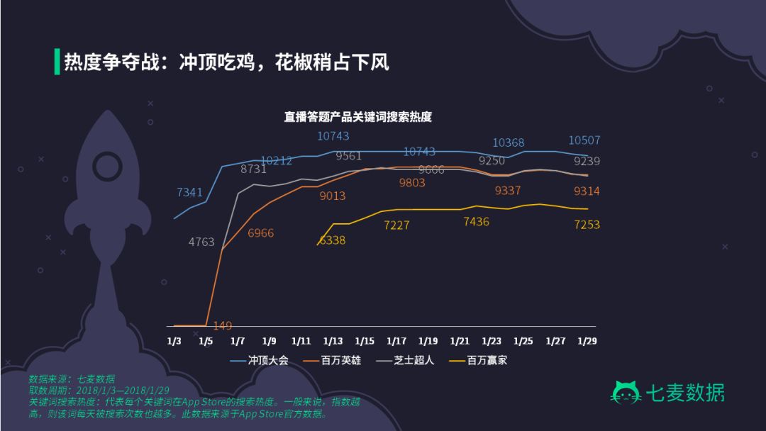 本次七麦研究院推出《2018 年 1 月直播答题 App 数据报告》,甄选目前比较火的几款直播答题产品,从排行榜、下载量、关键词搜索热度、宣传方式等 7 个维度进行分析,谁将突出重围成为领头羊?直播答题热还能持续多久?这些数据或许能让你洞察一二。
