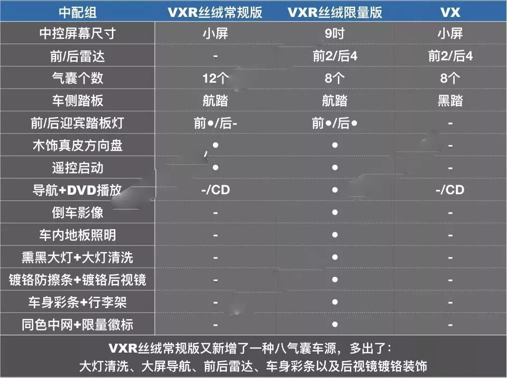 除了VXR丝绒常规版之外,中配组还有VXR丝绒限量版和VX常规版,但车源都很少。三者之间的配置差别,可以看这个表: