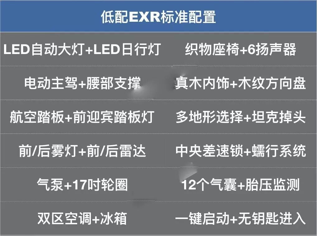 同时,低配EXR还拥有12气囊、遥控启动、航空踏板、前后雷达、后视镜倒影以及桃木方向盘,这是部分中高配型号都没有配备的。