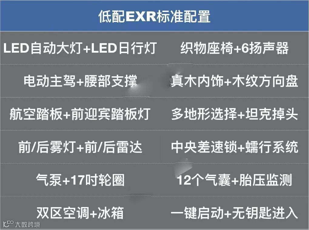 并且,低配EXR没有行李架,没有大灯清洗,也没有中控大屏。