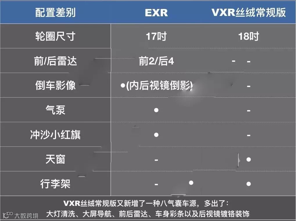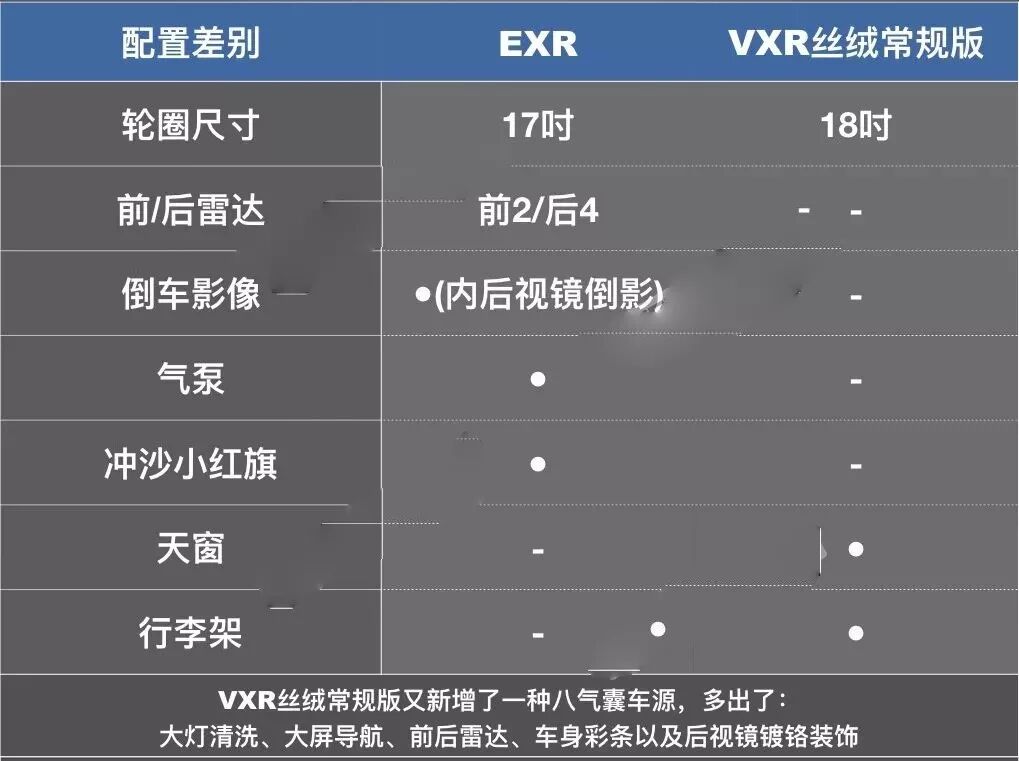 这其中,售价最低、并且销量最大的,是VXR丝绒常规版,报价94万元起步。它跟低配组EXR之间的配置差别,可以看这个表: