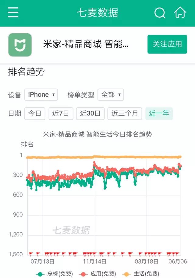 从数据上来看,米家给人的感觉就一个字“稳”,在近一年的榜单排名中都处于波浪浮动的状态,没有大起大落,在 App Store 生活(免费)榜单中 20 名左右的位置,波动很小。