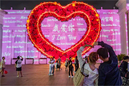 去恺撒宫前爱心玫瑰花墙拍张不同语言“我爱你”的告白照吧,恺撒宫内还有三小时的精彩演出《夜秀嘉年华》。