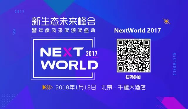 * 2018 年 1 月 18 日,NextWorld 2017 新生态未来峰会将在北京举行。大咖嘉宾已就位,他们的演讲中更能洞悉 2018 互联网行业趋势。长按识别下方二维码即可报名参与峰会现场。 我们等你。