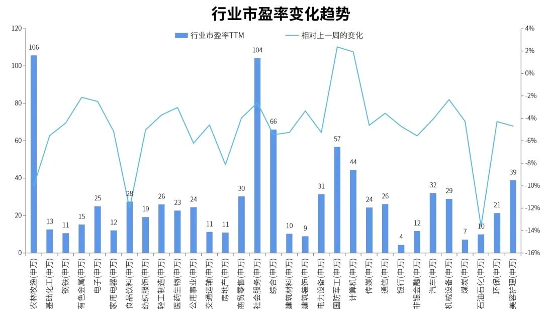 农林牧渔、社会服务和汽车处于相对高位;银行、基础化工和建筑材料行业处于低位
