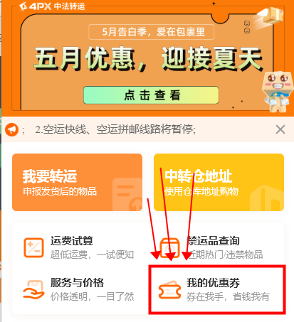 打开小程序首页,如图示点击【我的优惠券】,即可查看你已领取的优惠券