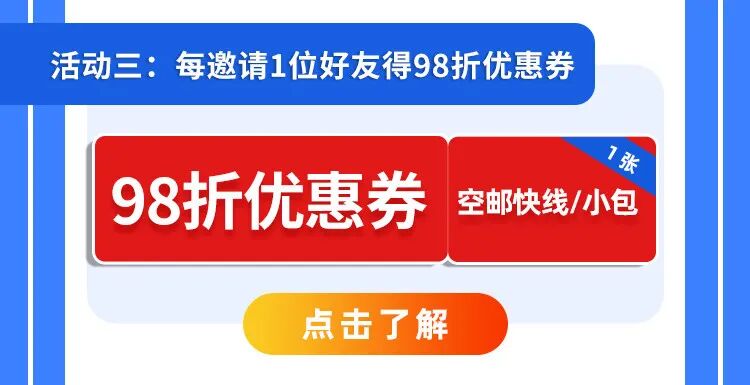 邀请方法参照活动二,可通过微信一键转发、发送海报、分享邀请码,3种方式邀请好友注册,好友通过你分享的链接成功注册后,系统将自动发放98折优惠券,多邀多得,上不封顶