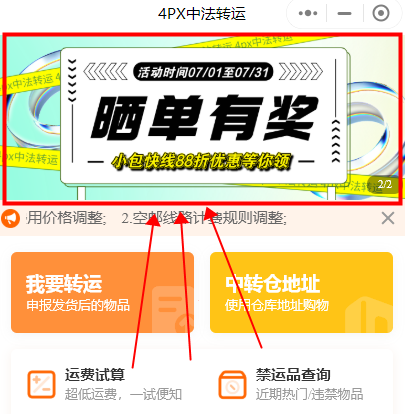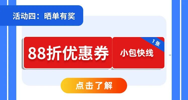 小程序首页点击【晒单活动】(如下图),按表格要求晒单即可获得小包快线适用的88折优惠券