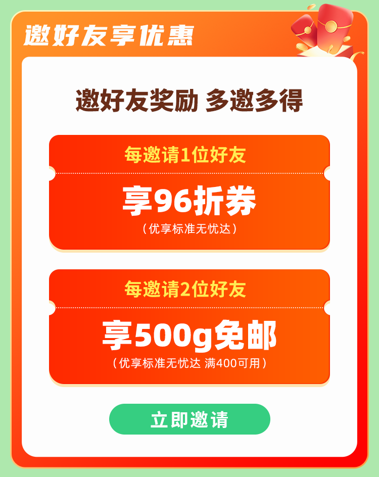1、活动时间(北京):即日起至4月30日24H,活动时间内邀请好友注册成功后,邀请人即可得对应优惠券;邀请1人,享无门槛96折,优享标准无忧达线路可用;邀请2人,享500g免邮(满400可用),优享标准无忧达线路可用;多邀多得,上不封顶,如数据作弊则收回优惠。