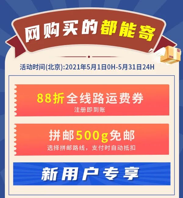 拼邮500g免邮可叠加88折优惠券使用!新用户优惠就是这么给力,直接转运0元起!另外免邮券直接免500g运费+清关费,注册之后一定不要忘记使用新用户优惠,省下更多小钱钱!