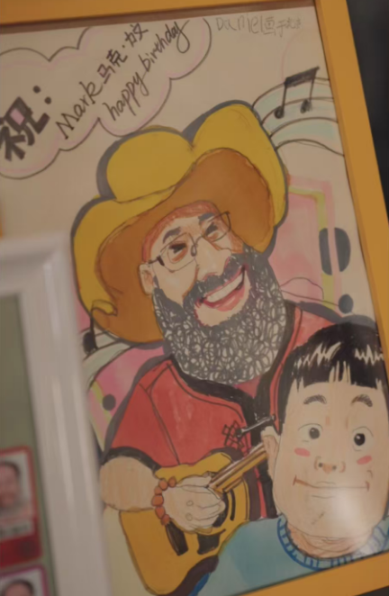 在他的公寓里,有一副手绘的图画,画面上是马克经典的牛仔帽、大胡子、中式服装的造型,旁边有一个小孩圆圆的脸蛋,笑得灿烂,这是马克学校同事的儿子画的一幅画,用来祝福马克生日快乐。这幅画被裱起来,放在很显眼的位置。