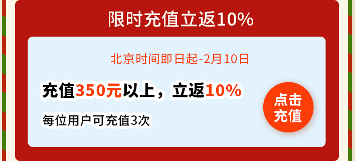 350rmb起充,即充即返现10%,上不封顶,充得越多返得越多!