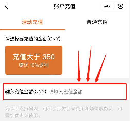 选择【活动充值】,直接点击底栏的【进行充值】充值350或手动输入充值金额,即可参加充值返现活动