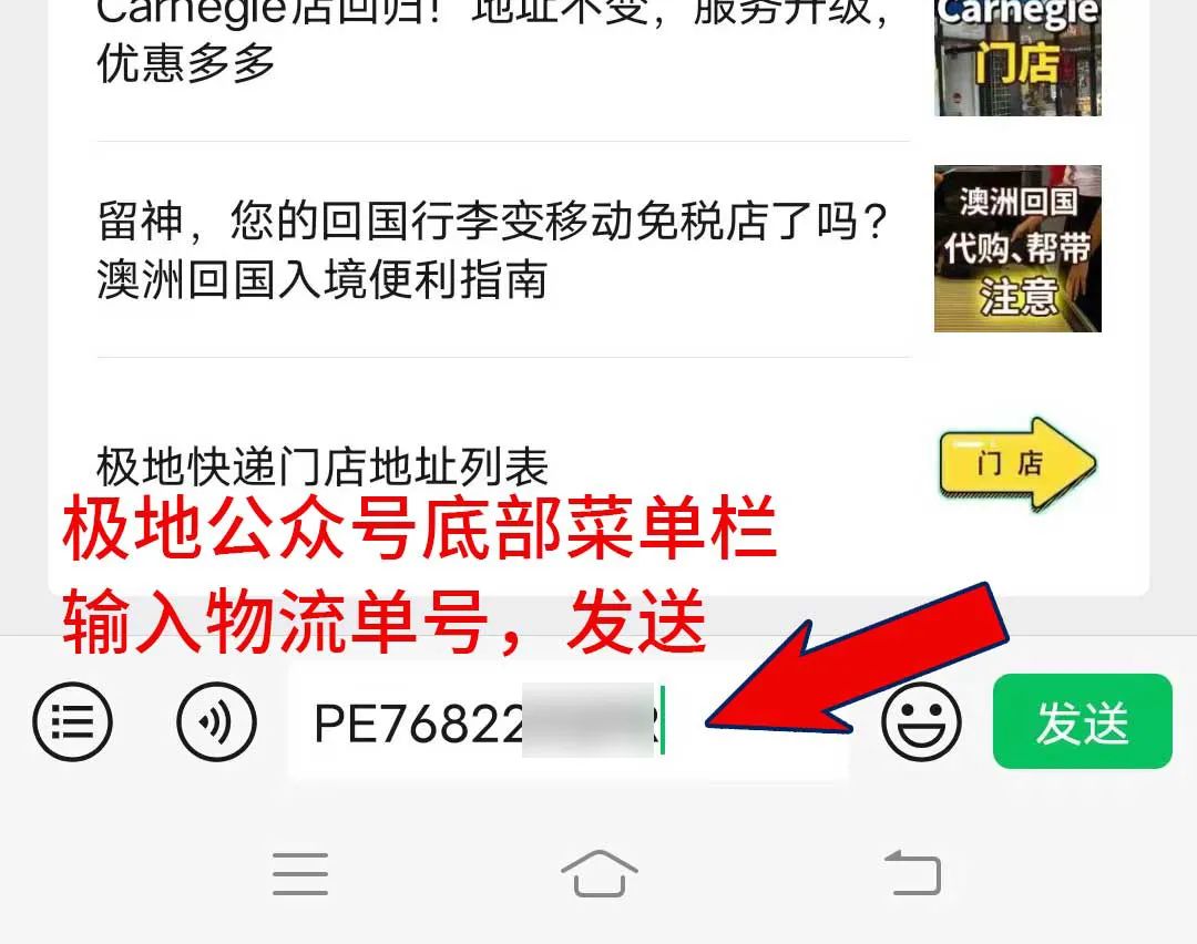 在极地公众号底部菜单栏,切换至发消息界面,发送您包裹的极地物流单号,系统将自动为您查询并以公众号消息的形式回复给您。