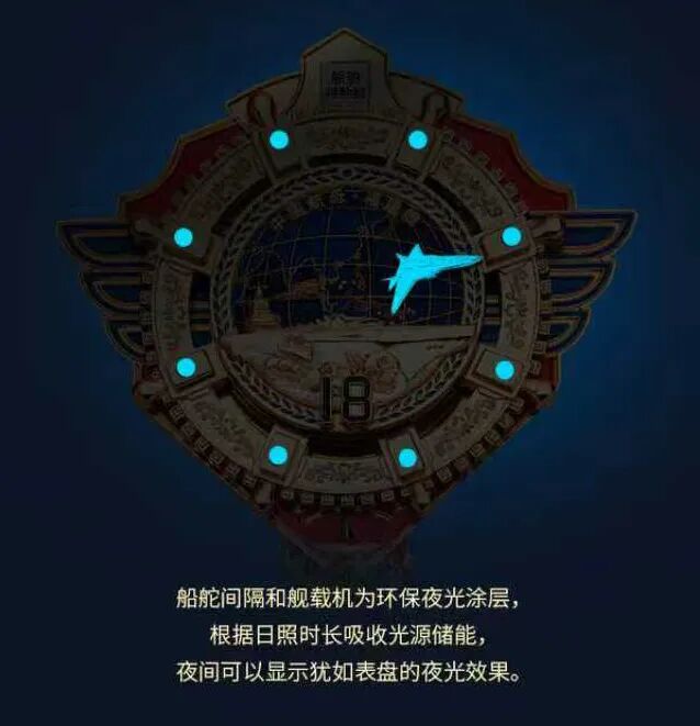 它还有一个惊喜夜光设计:黑暗中,徽章上的战机会变成指针,整体形似表盘,寓意时间和坚持铸就成功。