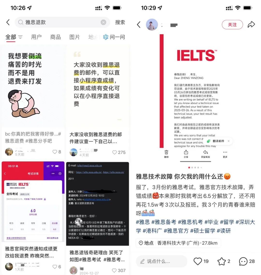 在社交平台,相关讨论持续升温。南都记者在小红书上以“雅思改分”“雅思退款”为关键词搜索,发现网友对此评价褒贬不一。