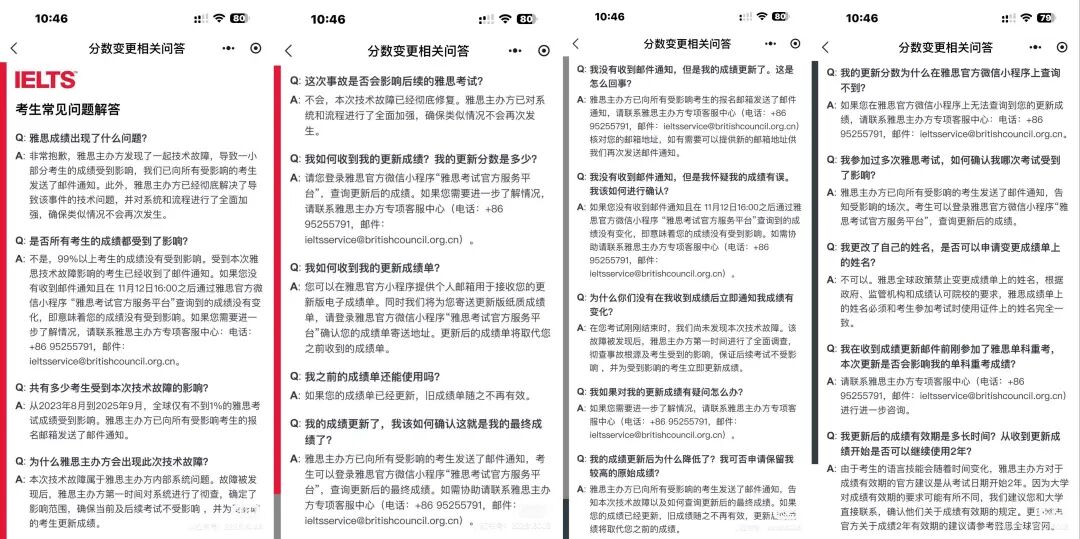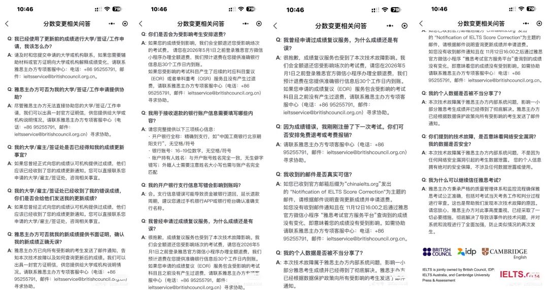 雅思方面还明确了具体善后流程:考生需通过雅思官方微信小程序查询更新成绩、确认邮寄地址以获取新版纸质成绩单,退费需在2026年5月1日前通过小程序办理,预计30个工作日到账。
