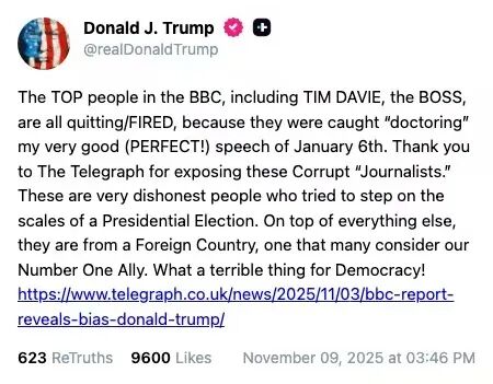 美国总统特朗普在社交媒体上评论称,BBC高层辞职或被解职,是因为他们“被抓到篡改我那场非常好的(完美的)1月6日演讲”。
