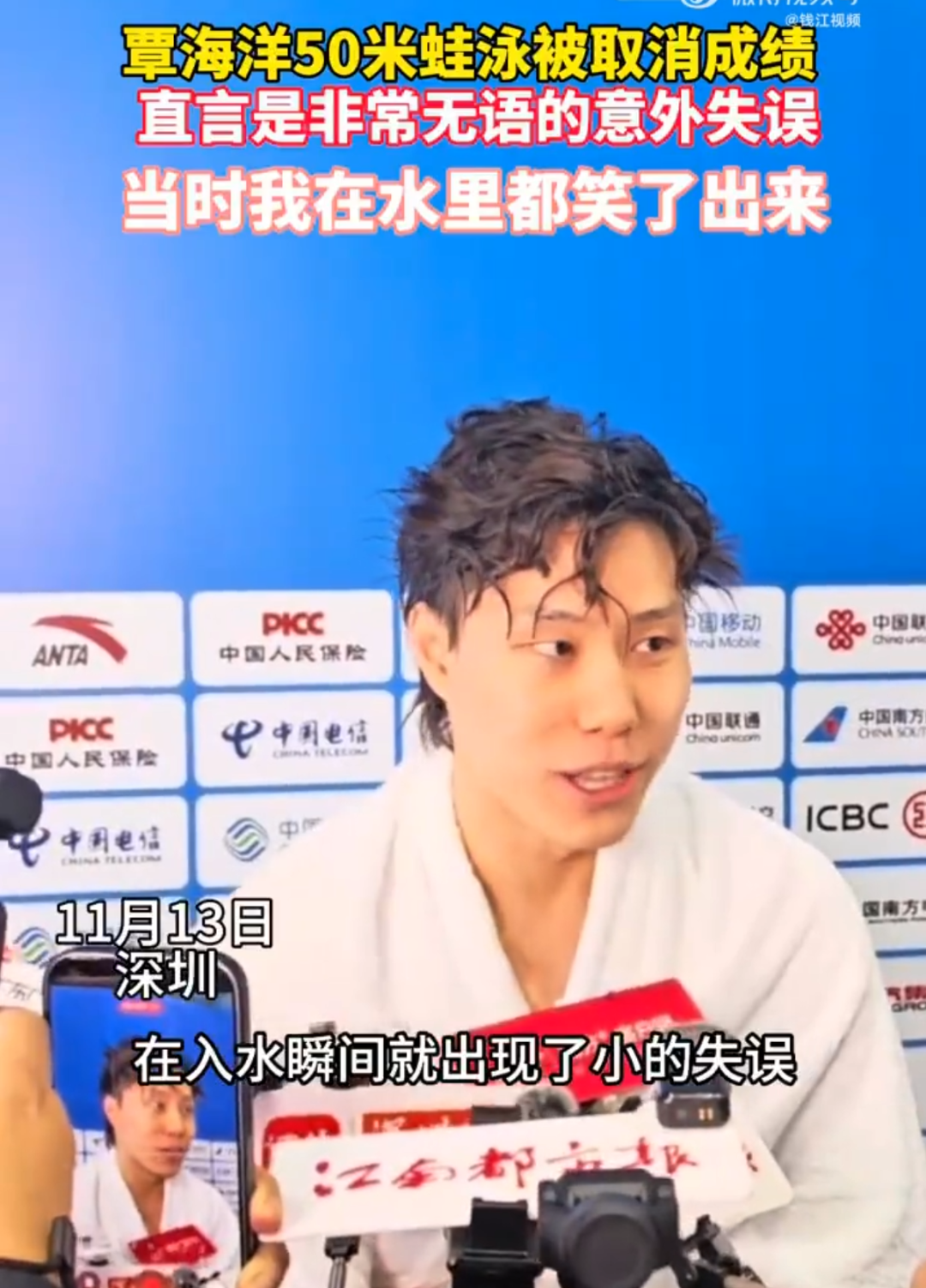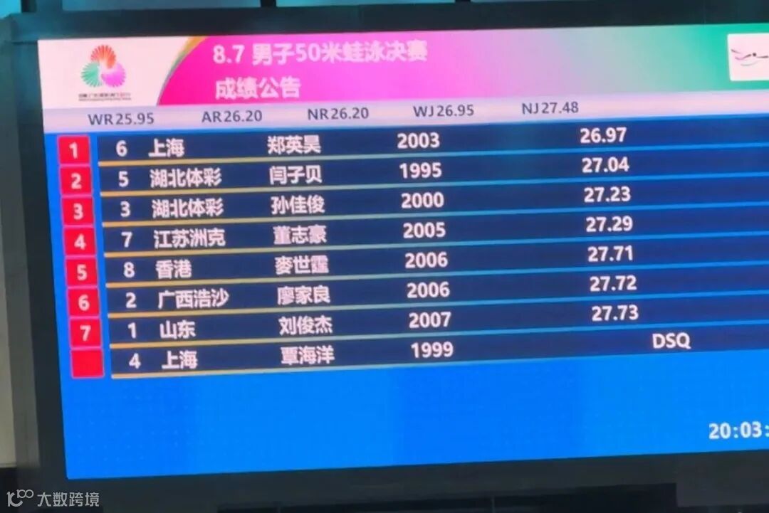 11月13日,全运会男子50米蛙泳决赛发生戏剧性一幕,奥运冠军覃海洋因犯规被取消成绩,他的上海队队友郑英昊以26.97的成绩摘得金牌。湖北队的闫子贝和孙佳俊分获第二第三名。