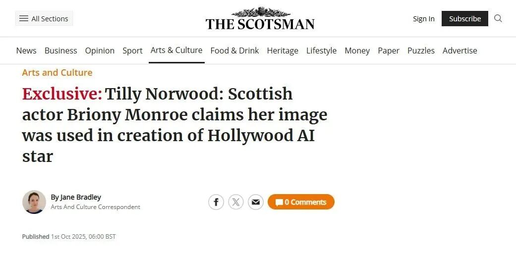 据英国《苏格兰人报》(the Scotsman)报道,一名苏格兰演员称自己的形象被用于打造诺尔伍德,相关组织将为她提供相关支持,采取行动抗议科技公司与娱乐公司,未经许可在AI内容中使用其会员的肖像、形象及声音。