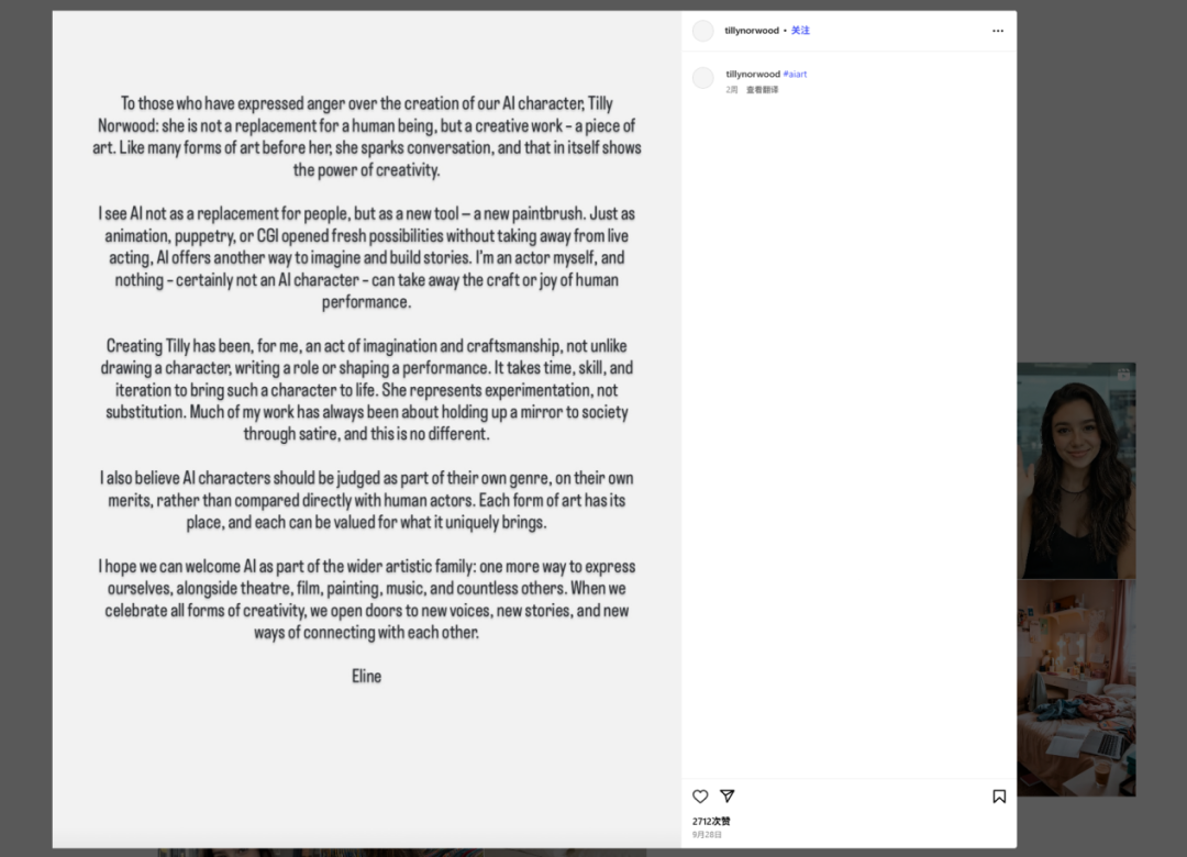 Amid the anger and backlash in Hollywood, the Dutch creator posted on Tilly's Instagram page to say that the creation is "not a replacement for a human being, but a creative work –a piece of art".