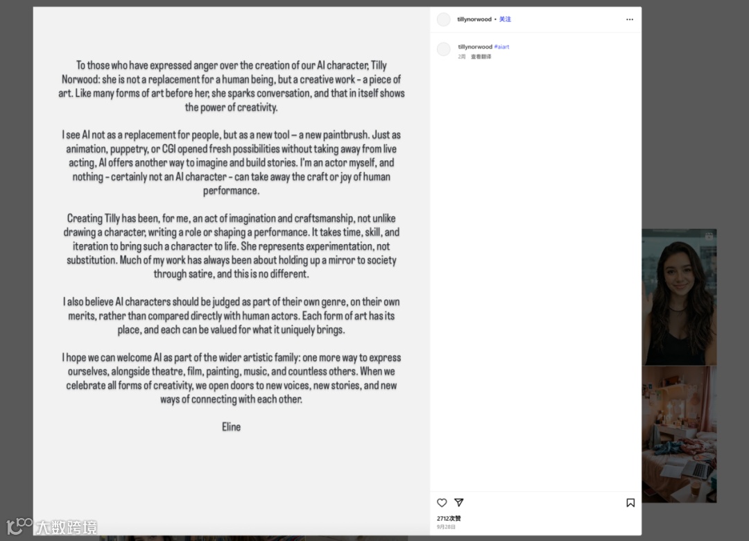 声明指出:“诺尔伍德不是演员,而是一个计算机程序生成的角色,该程序未经允许、也没有补偿,就利用无数专业演员的表演成果进行训练。她没有人生经验,没有情感。观众对脱离人类体验的虚拟内容并不买账。这样的角色并没有解决问题,反而制造了问题:它窃取演员表演,威胁到他们的工作,伤害生计,并贬低人类艺术的价值。”