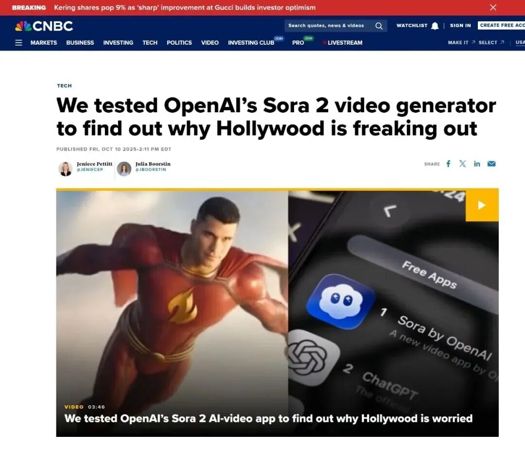 据美国CNBC近日报道,最新版的OpenAI Sora 2应用程序,只需用户输入提示词就能免费生成短视频。