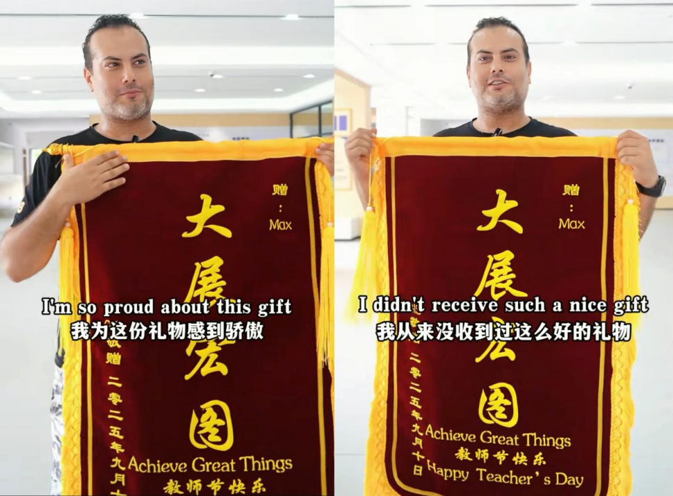 On Teachers' Day, a foreign teacher was deeply moved when she received a special gift from her students: a commemorative banner inscribed with the humorous and affectionate title "Superwoman". The teacher was both surprised and touched by this blend of traditional form and modern wit, saying it was the first honor banner she had ever received, a gift she would cherish forever.
