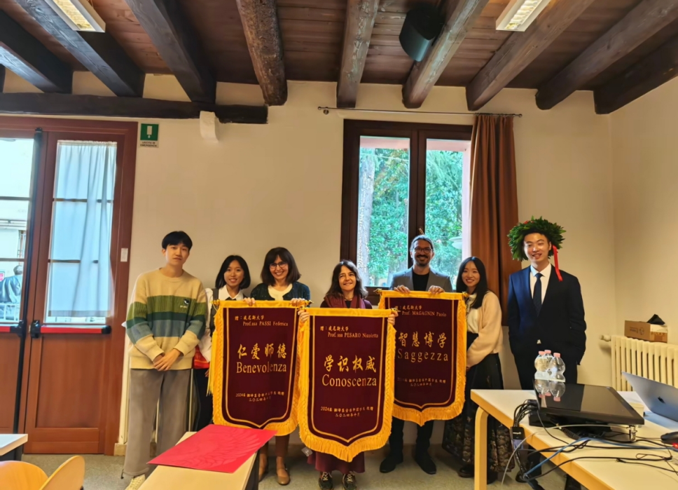 在意大利,几位威尼斯大学的中国留学生在毕业时,也向自己的老师赠送了锦旗。