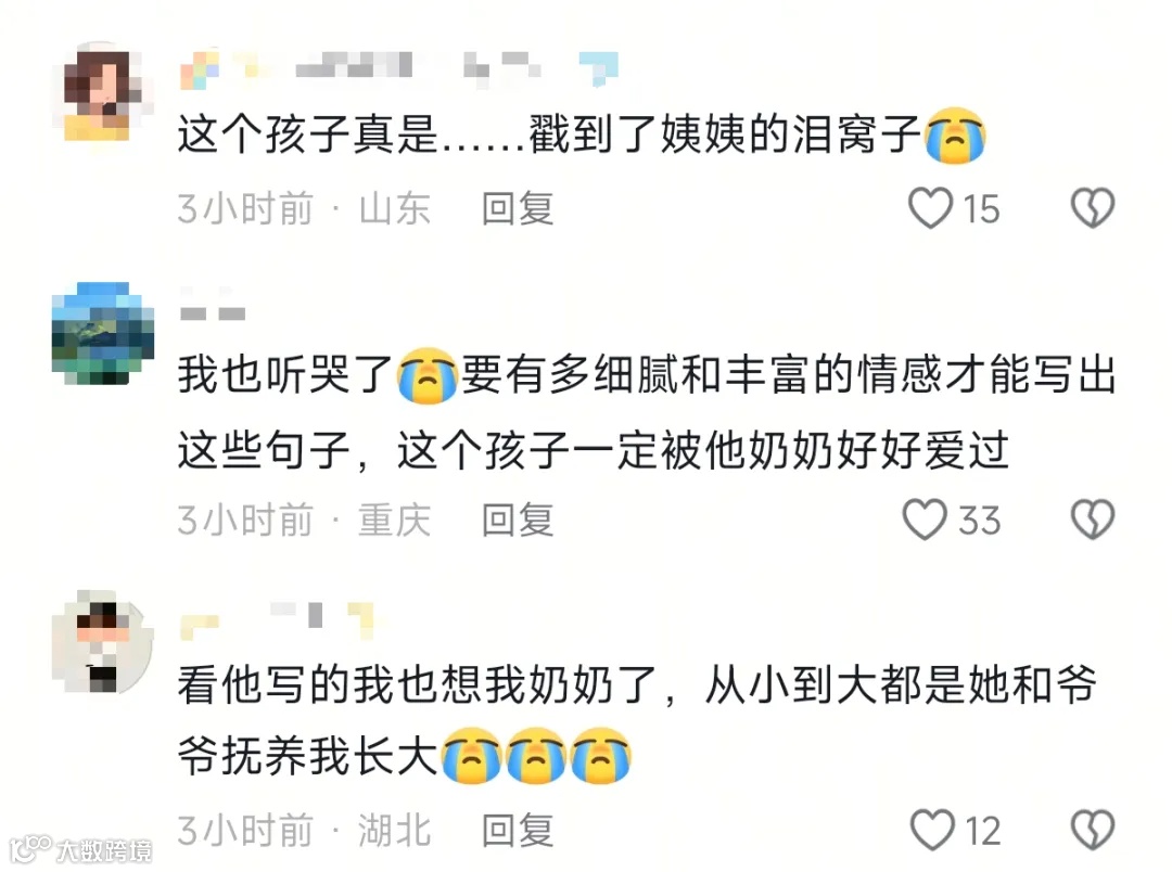 这篇作文很快引发了网友们的集体共鸣,无数人在评论区倾诉着自己对奶奶的思念,有网友说:“奶奶带大的孩子才懂。”