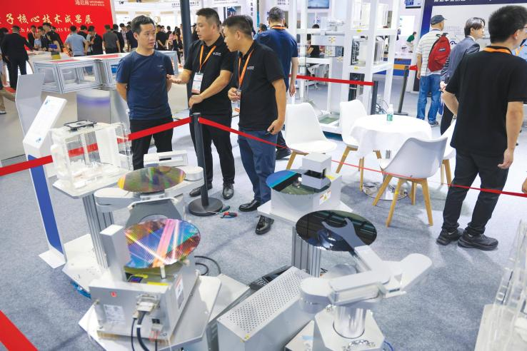 在广东省深圳市举办的2025年维信湾半导体生态博览会上,一台机器人正在搬运硅晶圆进行加工。此次博览会吸引了600多家企业参展,展示了包括晶圆制造和芯片设计在内的多项技术。图源:新华社