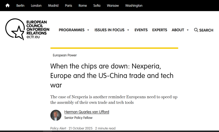 10月23日,大众汽车甚至公开承认可能会有停工的危险。欧洲的媒体和分析者们自然也不会客气,欧洲对外关系委员会高级政策研究员赫尔曼·夸尔勒斯·范·乌弗德在该机构官网上发表文章,直指要害:“这项干预有可能导致政府声称想要避免的结果……它给安世半导体公司带来了生存危机,并导致中国可能采取反制措施,从而引发的供应短缺扰乱汽车生产。”