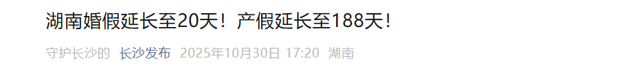 Hunan province in Central China has introduced new measures to build a "birth-friendly society", which includes encouraging employers to offer up to 20 days of marriage leave and extend maternity leave to 188 days.