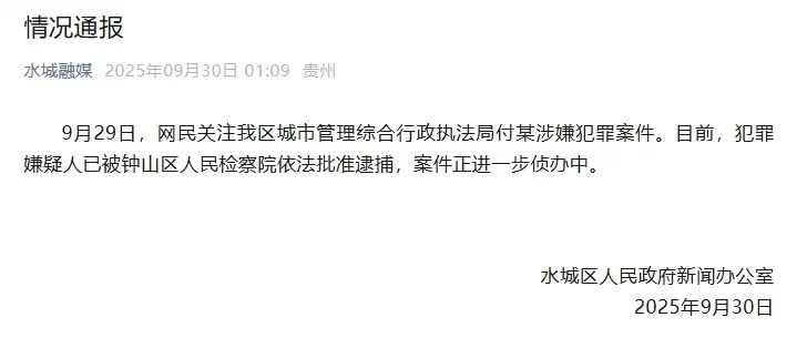 9月29日,网民关注我区城市管理综合行政执法局付某涉嫌犯罪案件。目前,犯罪嫌疑人已被钟山区人民检察院依法批准逮捕,案件正进一步侦办中。