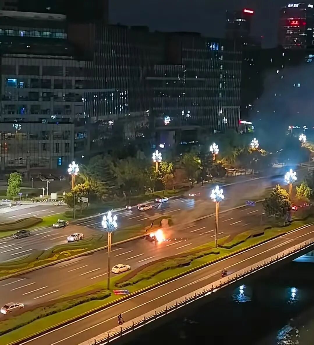 Subsequently, the car accelerated, lost control, and collided with a green belt before flipping into the opposite lane and catching fire. A dashcam from another driver captured the vehicle speeding past from the right just before the impact, with flames erupting shortly after.