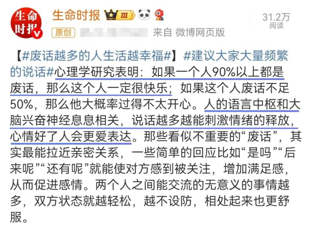 心理学研究表明,废话越多的人生活越幸福。如果这个人废话不足50%,那么他大概率过得不太开心。