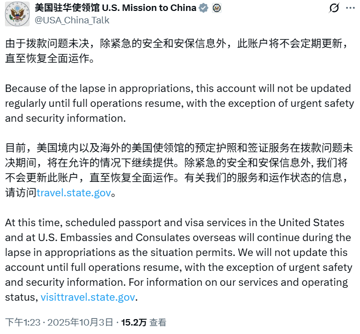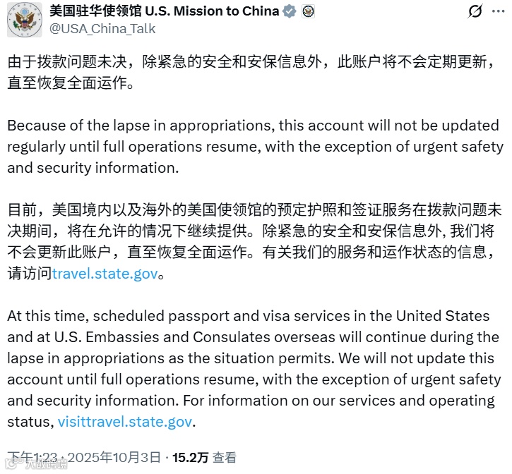 10月3日,美国驻华使领馆官方账号在社交媒体“X”上发布公告称,由于拨款问题未决,除紧急的安全和安保信息外,此账户将不会定期更新,直至恢复全面运作。