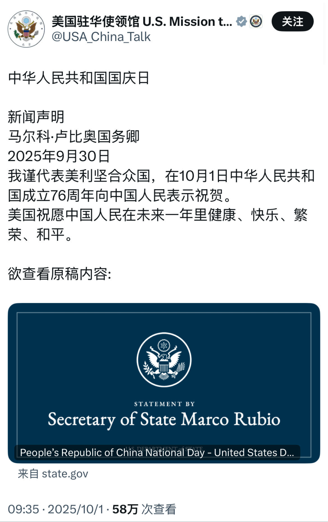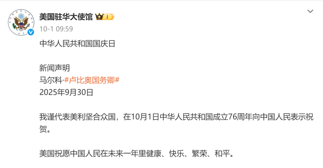 美国驻华大使馆的官方微博账号最后一条消息也停留在鲁比奥的国庆祝贺。