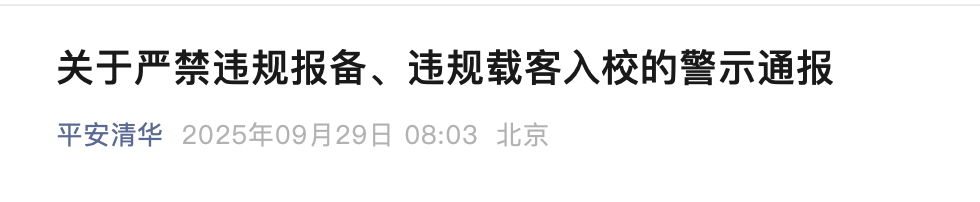 29日,“平安清华”微信公众号发布《关于严禁违规报备、违规载客入校的警示通报》。